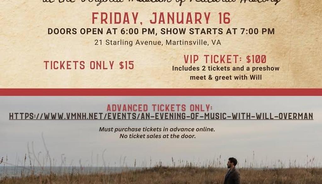 Move to Martinsville will be hosting a fundraiser music show at the Virginia Museum of Natural History on Friday, January 16th with Will Overman! Advanced Tickets Only: https://www.vmnh.net/events/an-evening-of-music-with-will-overman