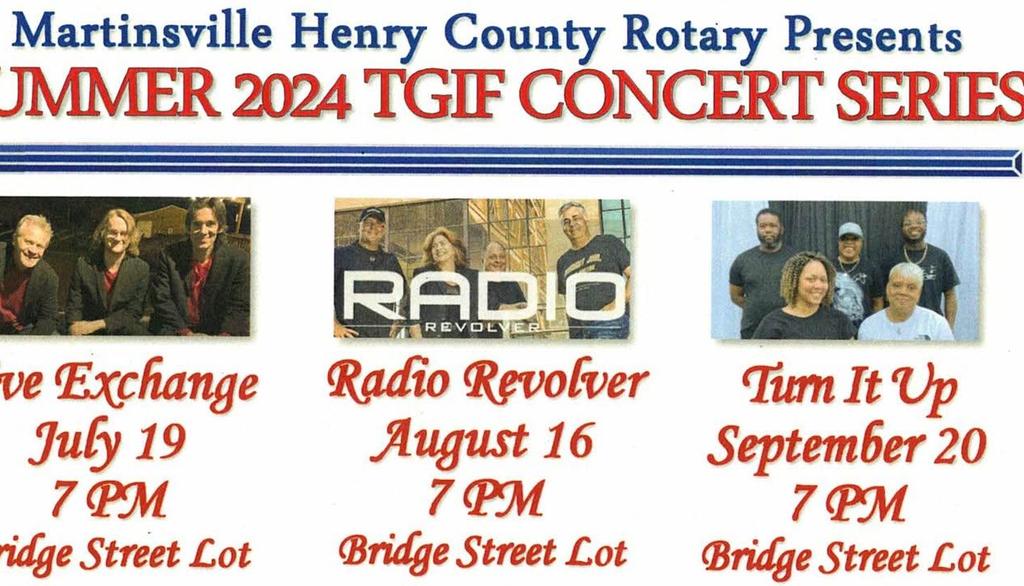 The Martinsville Henry County Rotary Club is hosting the Summer 2024 TGIF Concert Series in ...